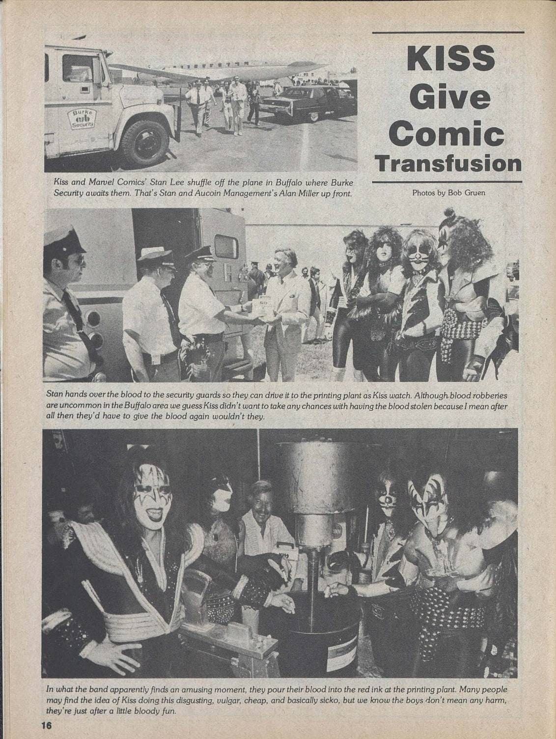 On 25. May 1977, Kiss & Stan Lee arrived at Borden Chemical Company to put the blood, which was drawn from each Kiss member on February 21, 1977 at Nassau Veterans Memorial Coliseum, into the ink for the upcoming Marvel Super Special #1. Buffalo television stations & local radio stations WKBW & WGRQ covered the high profile event. Rumour has it that their blood/ink actually went into that month’s Sports Illustrated! This was the last time Kiss would appear in their Destroyer/Rock N Roll Over costumes.