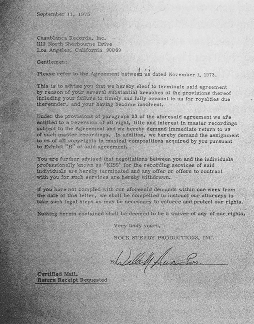 “Our royalty issue with KISS erupted again. We weren’t in any better position to cut them a check than we’d been six months earlier, when we signed the new contract with them. They knew it, and we knew it. The May 1 agreement had felt like a small victory, but in terms of royalty payments, it was nothing more than a delay tactic. Neil and I knew that KISS’s patience would soon run out. On September 15, 1975, he showed me a letter of termination from Bill Aucoin. KISS was leaving Casablanca.